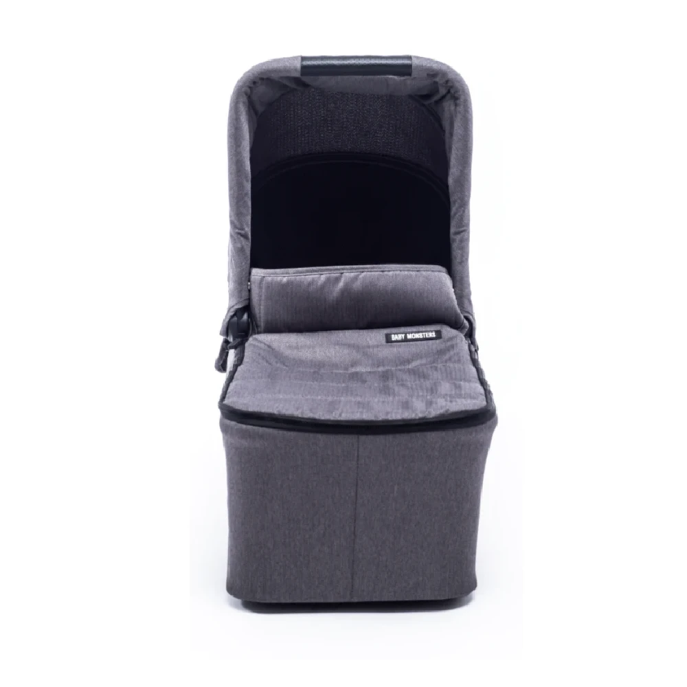 The Baby Monsters Easy Twin 4.0 Carrycot Black/Texas comes complete with a well-padded mattress and apron with storm flap to keep cold breezes at bay. For your babyβs comfort, the ample UPF50+ hood features a rear zipped ventilation panel and a flip out sun visor concealing an integral mosquito net. There is also a rain cover included for wet weather.