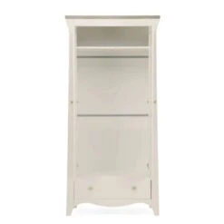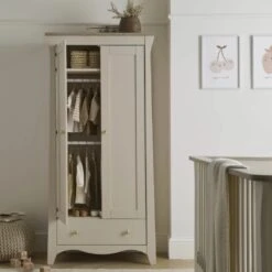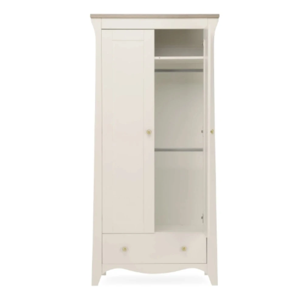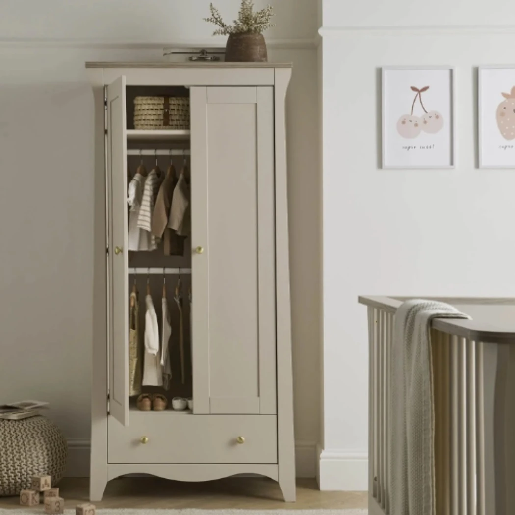 The Clara Nursery Wardrobe has ample room to keep your babyβs clothes organised. This double wardrobe has 2 removable hanging rails for keeping their tiny outfits neat and tidy. Inside the wardrobe is a deep shelf, perfect for storing baby bedding or blankets. Has a roomy drawer providing extra storage.