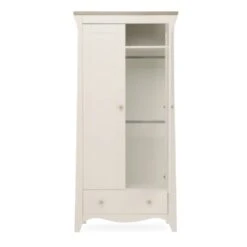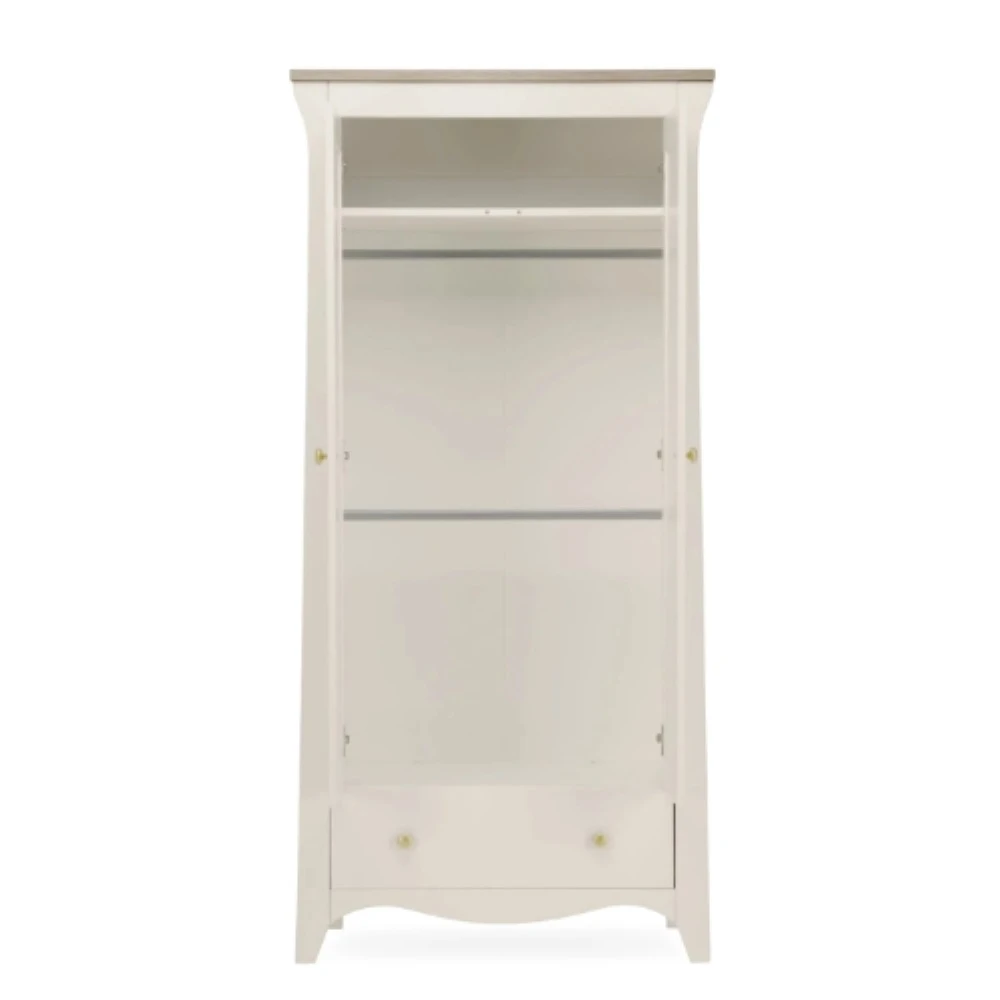 The Clara Nursery Wardrobe has ample room to keep your babyโs clothes organised. This double wardrobe has 2 removable hanging rails for keeping their tiny outfits neat and tidy. Inside the wardrobe is a deep shelf, perfect for storing baby bedding or blankets. Has a roomy drawer providing extra storage.