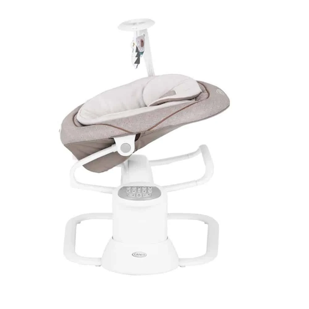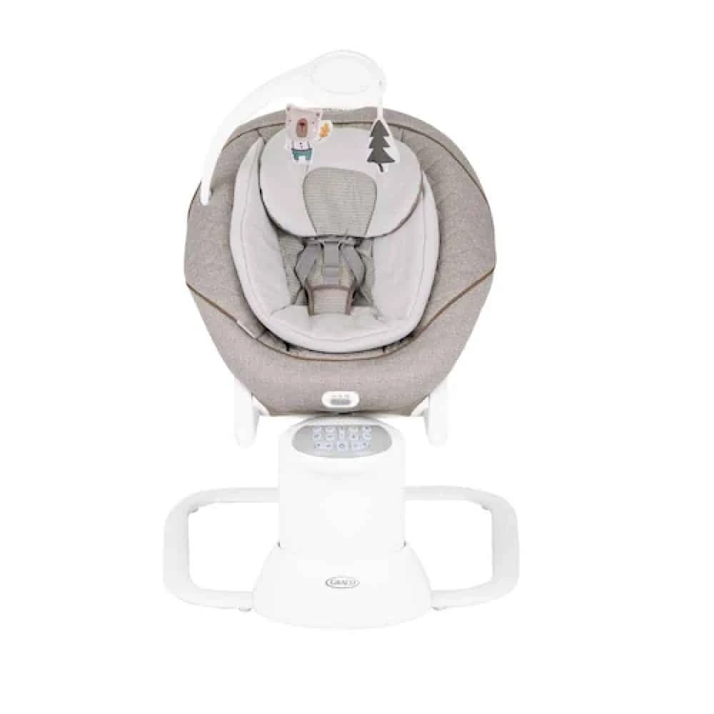 The Graco Move With Me Soother swings side to side, featuring 5-speed soothing motion and gentle vibrations to calm your little one in minutes. The multi-position recline seat creates the optimum environment for bottle feeding or nap time. This rocker has an audio system with 10 built-in melodies, 5 nature sounds. In addition, it supports phone or MP3 connection to play your babyβs favourite songs. The infant insert with 3-point harness keeps your baby cosy and secure at all times.