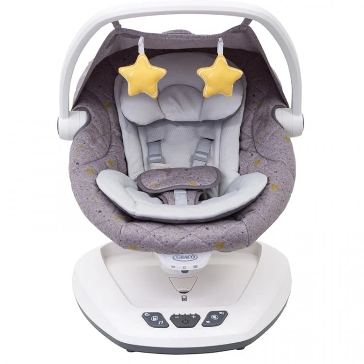 Calm and soothes your baby with the Graco Move With Me Swing with Canopy β Stargazer. This compact swing features an integrated carry handle and a two-step folding mechanism for easy room-to-room portability with your baby, and compact storage. It offers a two-position recline that provides comfort for your baby while asleep or awake, while two-speed vibration and gentle five-speed side-to-side swaying motion provides a relaxing experience. Move with MeΒ comes with 10 music options and 5 built-in sounds and also includes an mp3 adaptor, so you can play sounds, songs and recordings from your personal collection. The plug also provides added convenience, while a 5-point harness keeps baby cozy and secure. Battery operated for ultimate portability.
