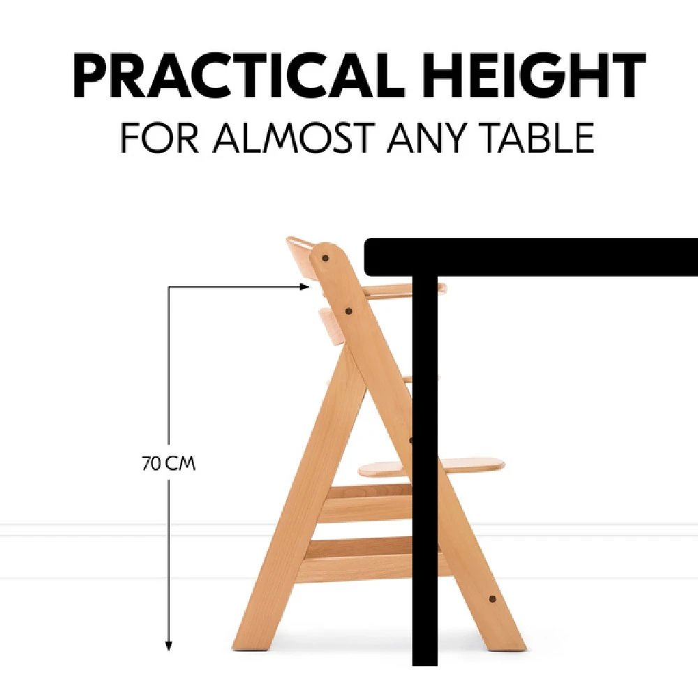 Thanks to the adjustable seat and foot plate, the highchair adapts to the height of your child and allows a comfortable seating position at any age. The highchair also fits under almost any table with the bumper bar at 70 cm from the floor and is a reliable companion that takesup to 90 kg.