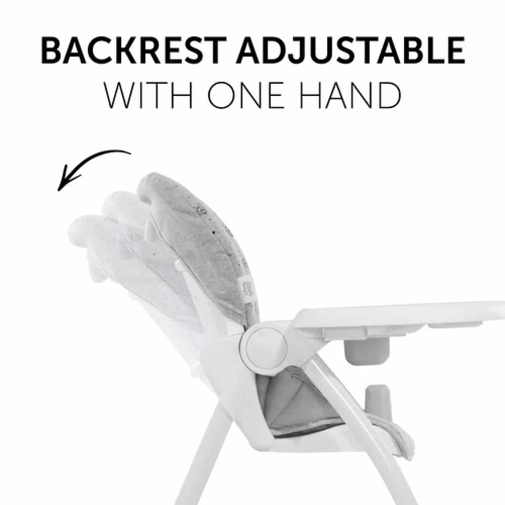 The practical Sit N Fold can be individually adapted.Β The tray can be adjusted in three positions, offering optimal space for your growing child.Β For cleaning, the tray can be removed and hung up on the highchairβs back until you need it again. The high backrest is softly padded and can be inclined to a resting position with one hand, always offering your little one well-being. Also, the integrated 5-point harness and anti-slip protection help keep your child safe.