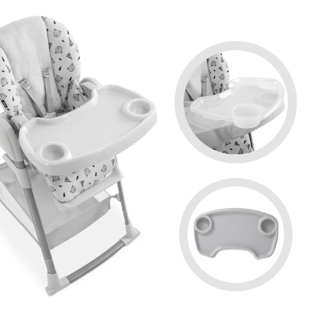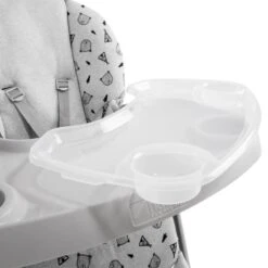 Once your baby can sit alone, you may use the high chair attachment. The backrest and footrest, as well as the food tray are adjustable in height or depth, and can be therefore adapted to your child’s height. In addition, the food tray has an elevated border and two practical cup moldings for everything to stay where it should.