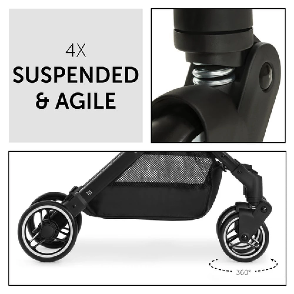 Thanks to the shock-absorbing suspension and smooth-running wheels, your child benefits from a comfy ride. Quick maneuvering through the shopping centre is also childβs play thanks to the swivelling front wheels.