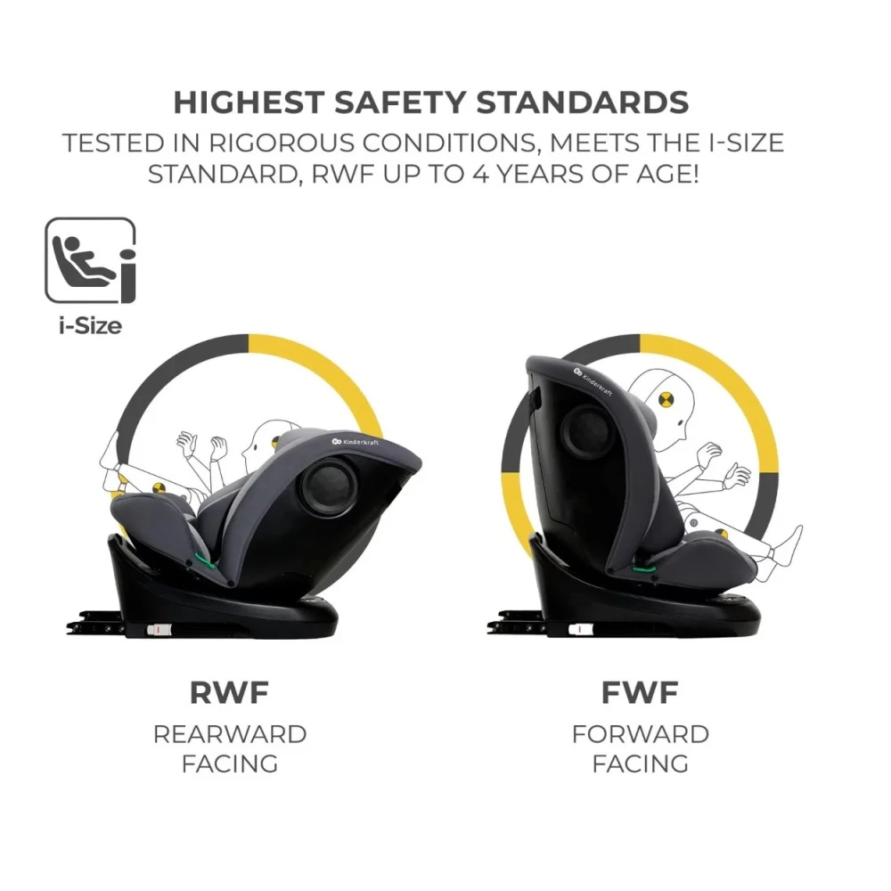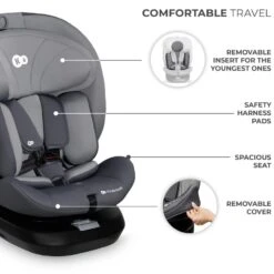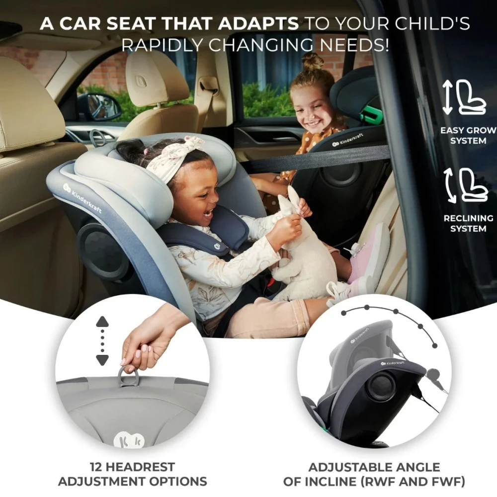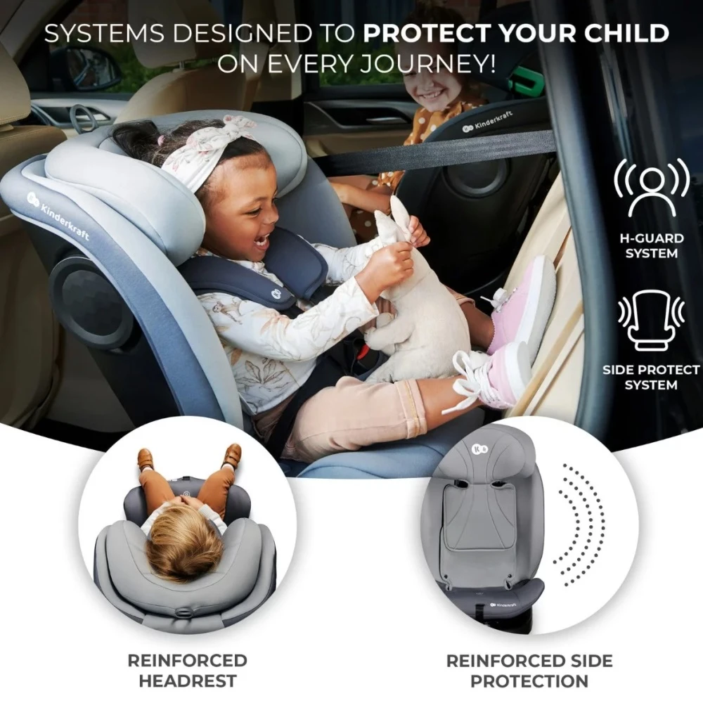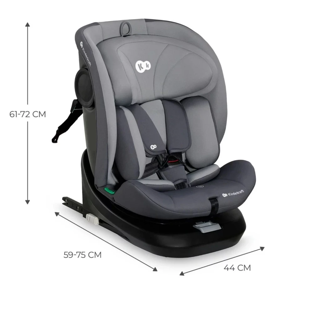 Kinderkraft Car Seat I-GROW i-SIZE 40-150cm β Grey is an easy spin car seat that will accompany you from birth up to approximately 12 years (36 kg/150 cm).Β Β Adjustable five-point safety harnesses and a durable shell are supported by additional safety systems such as H-GUARD, SPS+, or correct installation indicators: ISOFIX and TOP TETHER.