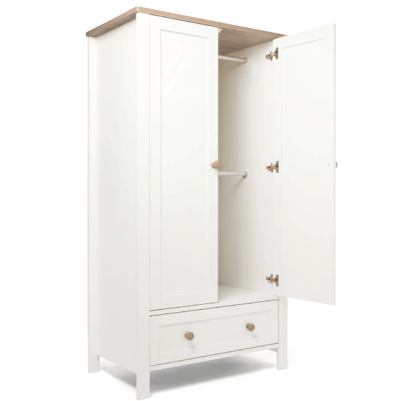 - Matching nursery cotbed, dresser and baby wardrobe comes in two-tone white with wood effect handles