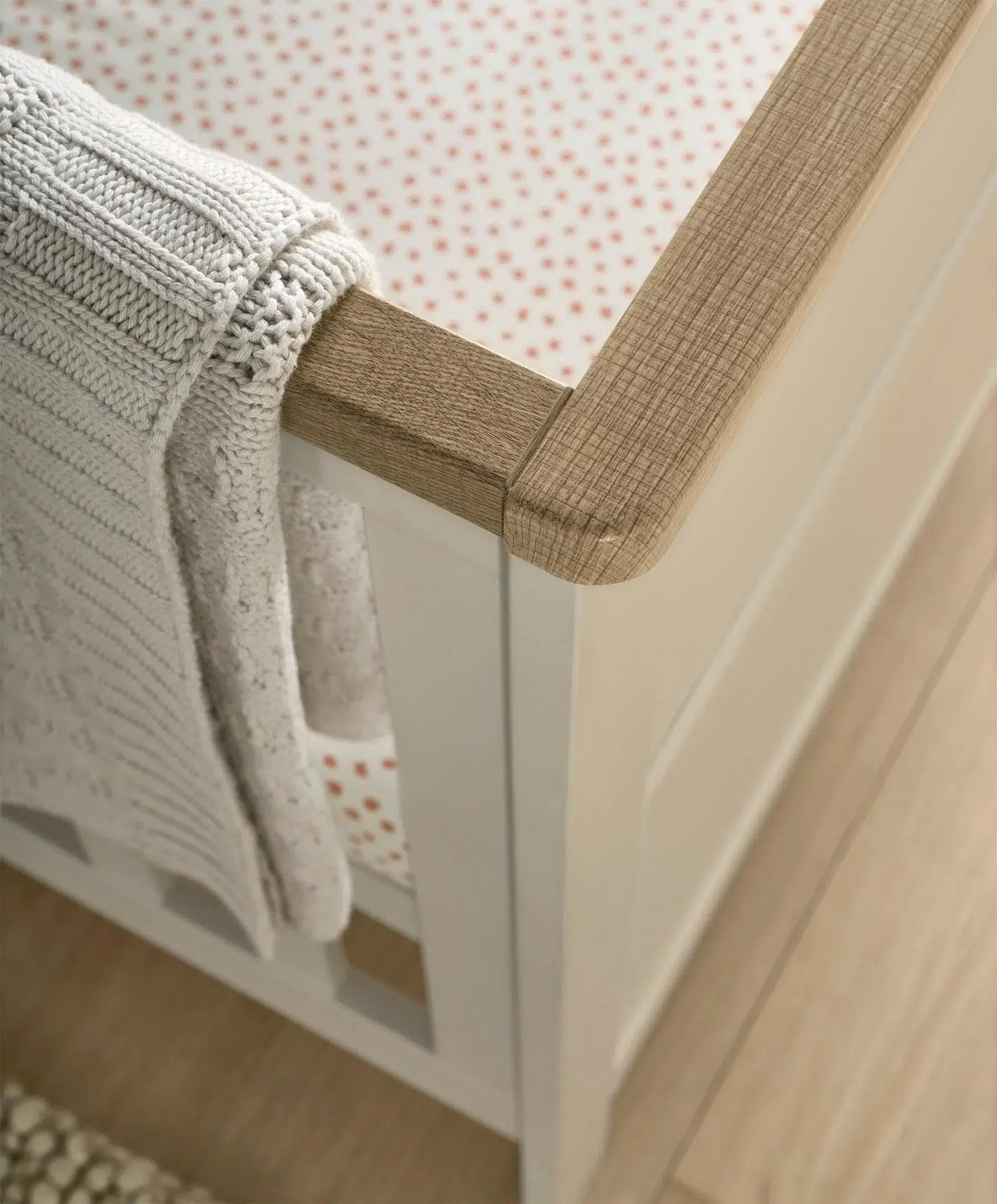 - Matching nursery cotbed, dresser and baby wardrobe comes in two-tone white with wood effect handles