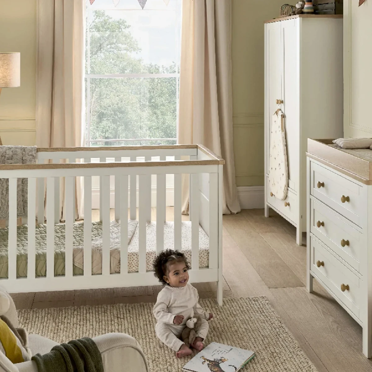 Thanks to a baby cot bed that converts into a toddler bed and a removable changing top for your nursery dresser, our Wedmore 3-piece nursery furniture set will see baby from newborn into toddler years and beyond. And when it’s time for a nap, the 3 adjustable cot base heights ensure baby is safe as they grow bigger and become more mobile.