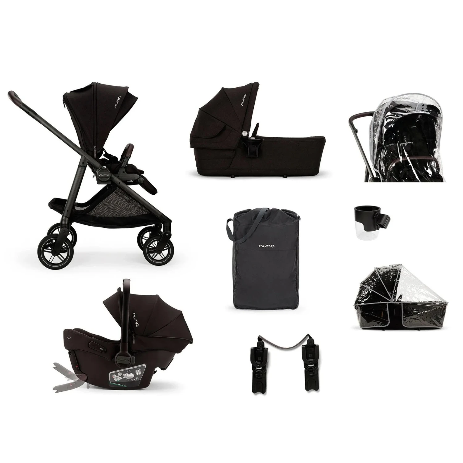 The Nuna Swiv Stroller, carrycot, Nuna Pipa URBN, Car seat adapters, Travel Bag, cupholder & raincovers for both the stroller and carrycot