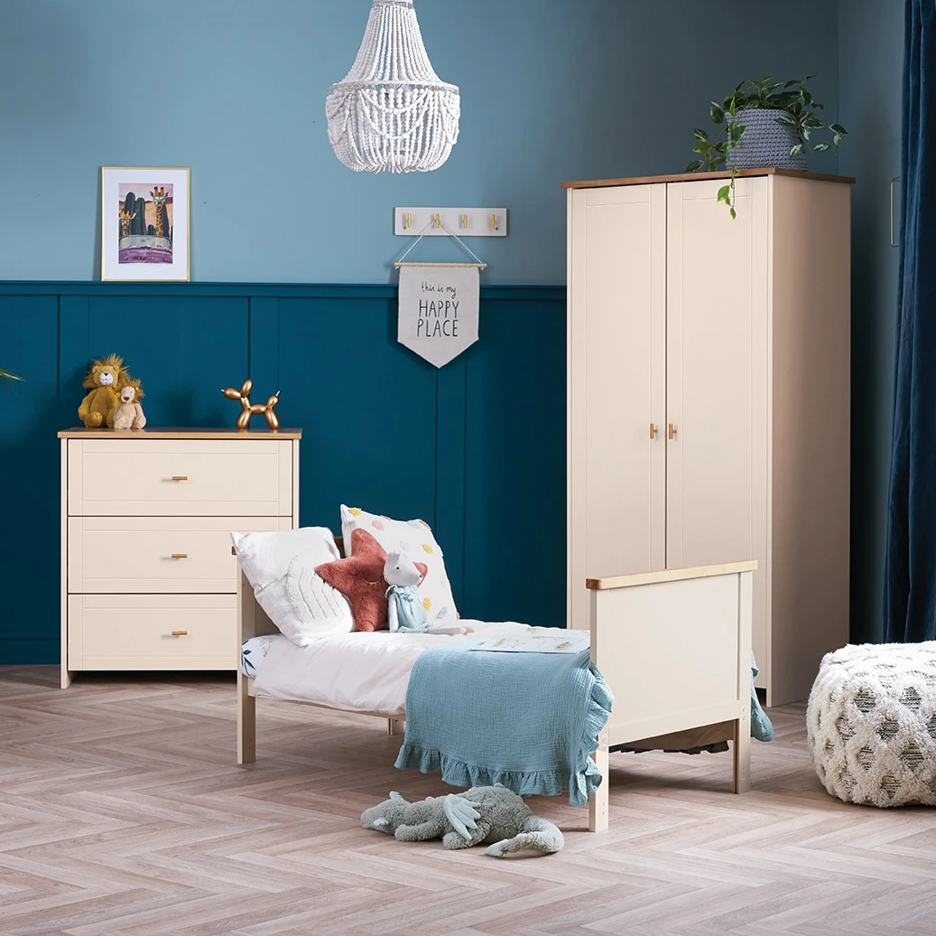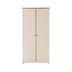 The Evie double wardrobe provides practical storage space with a double rail. The traditional finish, stunning natural wood and beautiful brass handled doors donβt compromise on design, while the large cupboard space includes two hanging rails and a single full width shelf for all your babyβs adorable outfits.