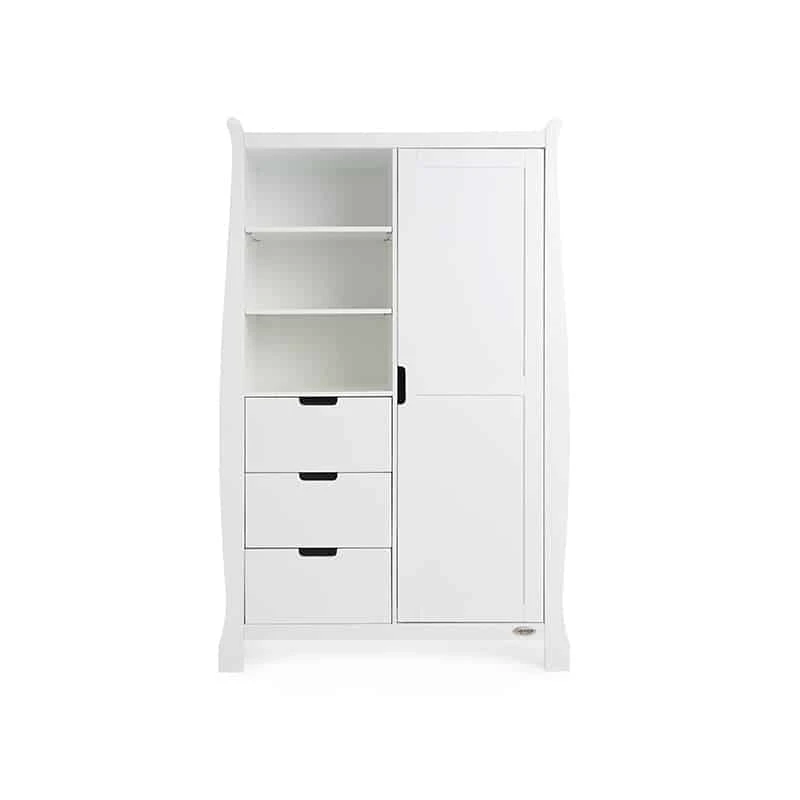 To complete the perfect nursery furniture set is the Stamford wardrobe. The quality of the design is complimented perfectly by the generous storage options available. A full height, soft close door encloses the main cupboard section with 2 hanging rails for storing little oneβs adorable outfits. For the smaller belongings, the left hand side of the wardrobe is divided between 3 height adjustable shelves, with 3 full depth drawers ensuring that thereβs always a perfect place for storing or displaying any precious possessions.