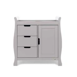 Also part of the furniture set, the beautiful changing unit is crafted using solid wood and features the same elegant scroll design that flows through the rest of the Stamford range. Sleek lines and recessed handles create a stylish and uncluttered look, whilst ensuring it remains snag free and simple to use. Itβs combination of three full depth drawers and full height cupboard with adjustable shelf and soft close door provide plenty of storage options for little oneβs precious belongings, whilst the cleverly recessed section on the top of the perfectly accommodates a changing mat.