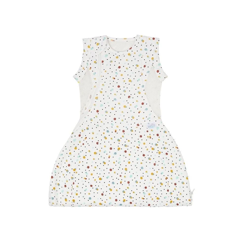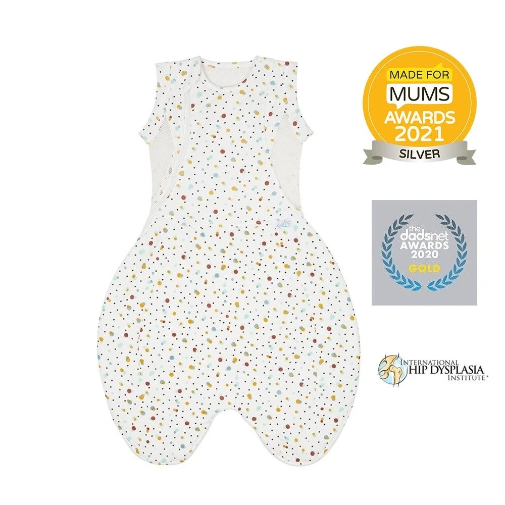Our innovative Purflo Swaddle to Sleep Bag Scandi Spot All Seasons 0-4 months, 2.5 tog has been developed to offer parents a safer, healthier bedding solution for newborns and young infants. It features unique breathable panels and the option to swaddle arms in or out. The Swaddle to Sleep Bag grows with new babies with an extended length which is certified hip healthy. Longer lasting and safe.