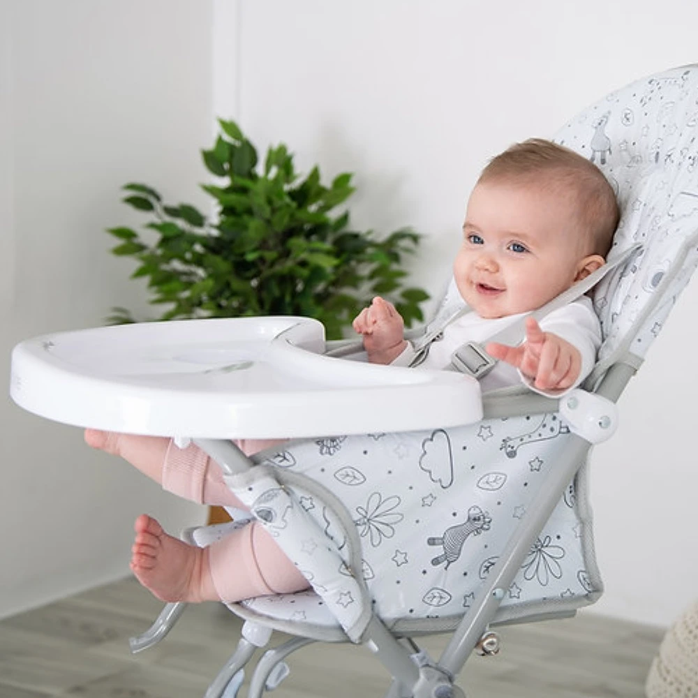 The Feed Me Compact has a useful foot rest for toddlers to give support. The large feeding tray includes an inset section for a drinking cup.