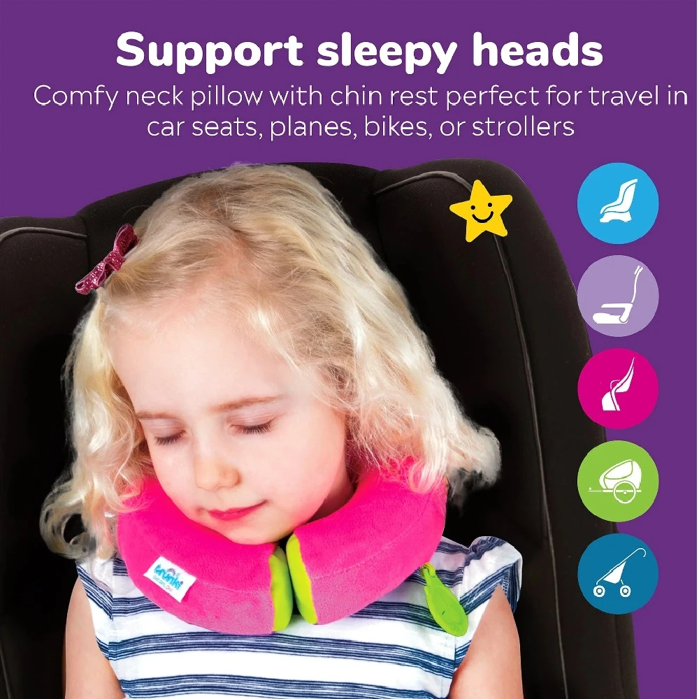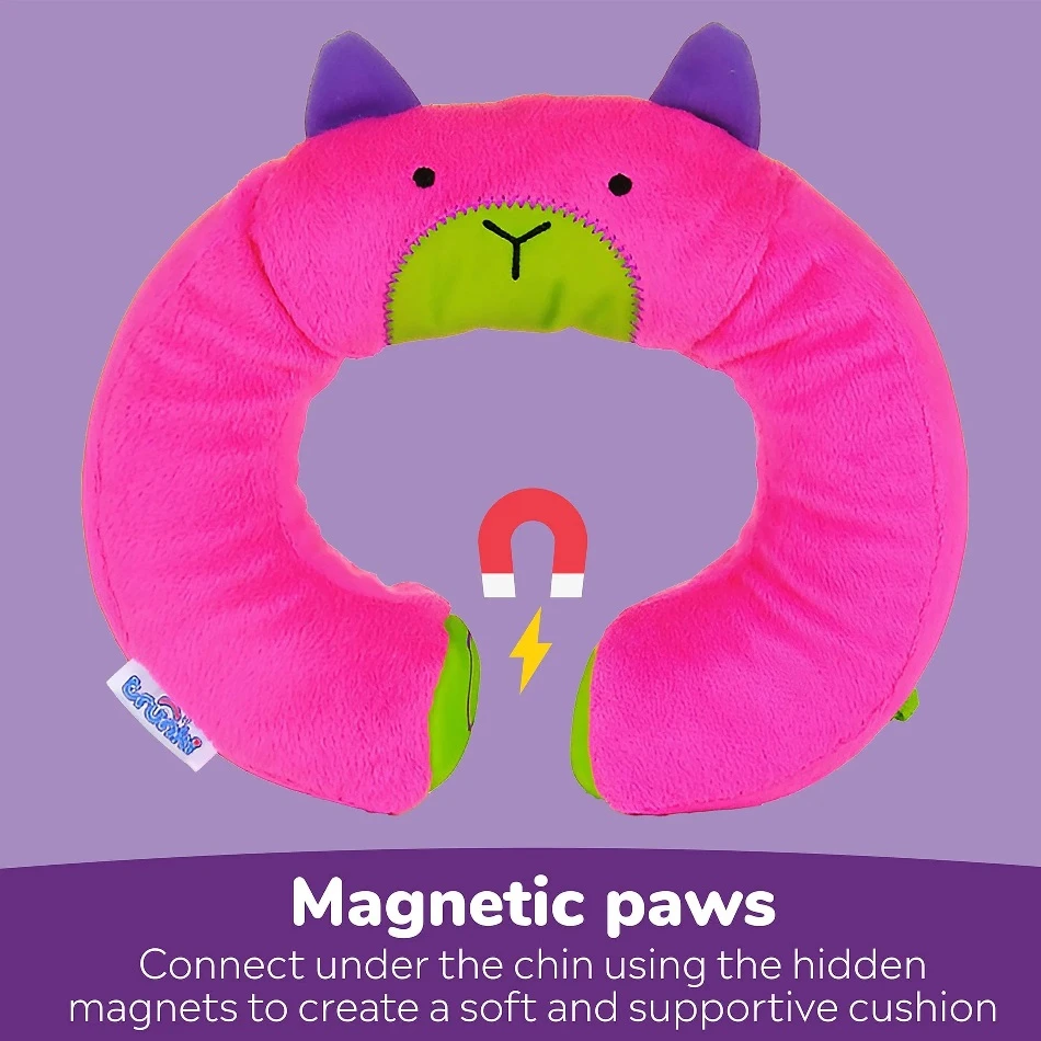 Trunki Yondi Travel Neck Pillow β Betsy is a specially designed travel pillow that connects under the chin with hidden magnets to form a soft and supportive cushion. This stops your childβs head rolling forward so they can snooze in comfort.