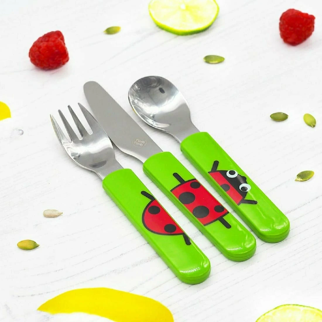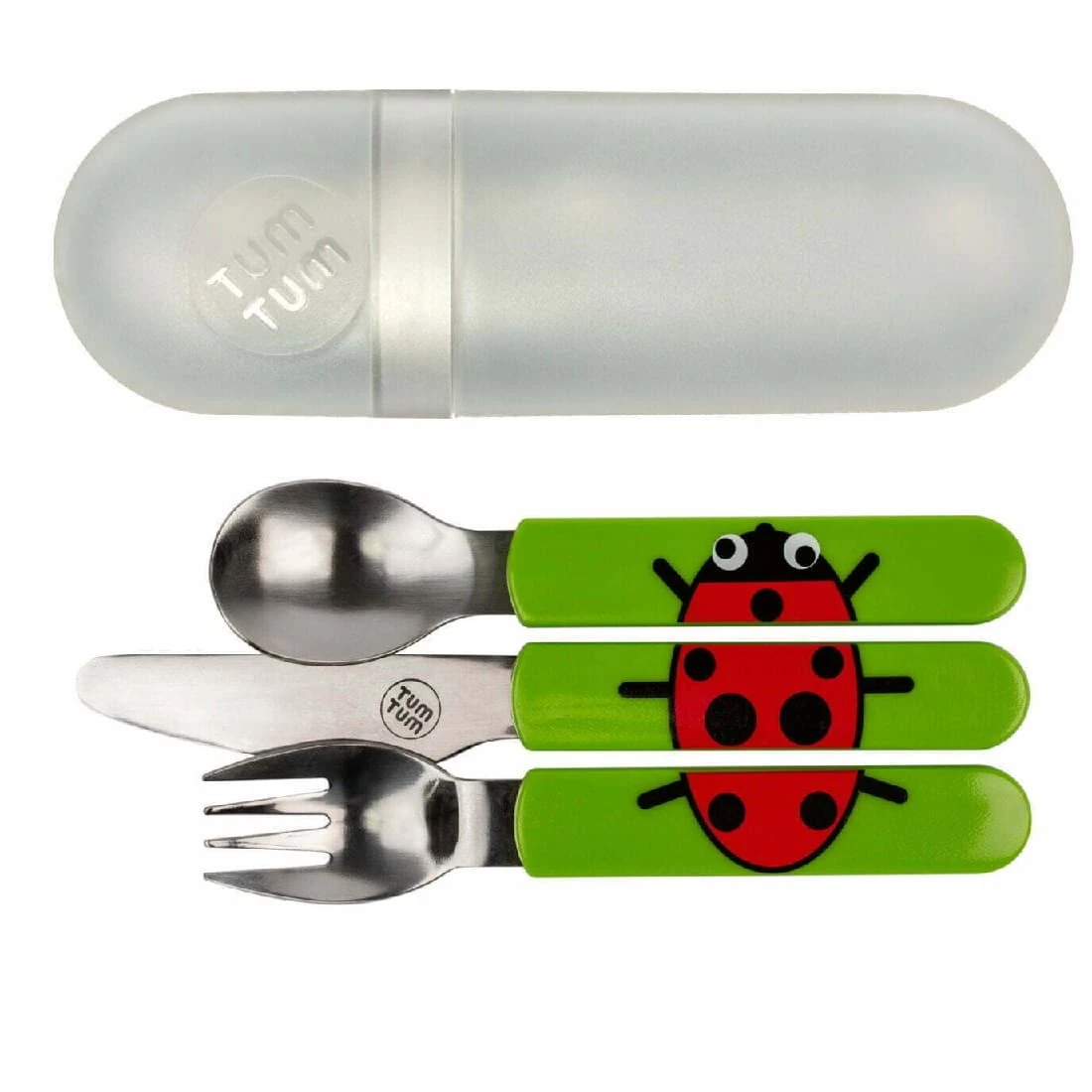 The Tum Tum Ladybird Travel Cutlery Set toddler cutlery designed to make eating easy and fun when learning to feed themselves. Inspire creativity during dinner time and make different pictures with the brightly designed handles. The set includes a bowl shaped fork to make scooping that little bit easier, a proper knife that is not too sharp but will actually cut food, as well as a spoon.