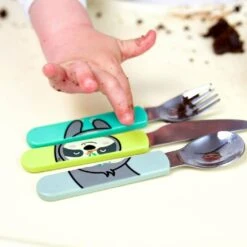 - Perfectly formed steel cutlery for teaching little ones how to feed themselves
