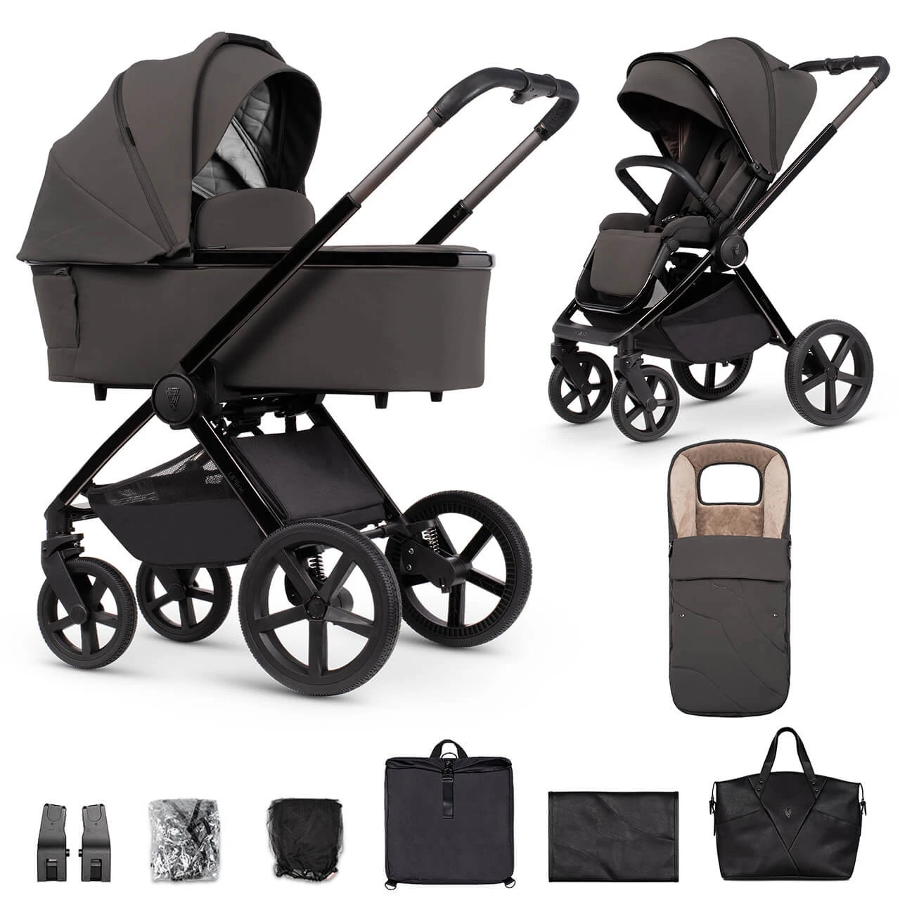 - All-in 10- piece bundle including eco-leather changing bag, changing mat, shopping bag, footmuff, raincover, mosquito net and car seat with adaptors